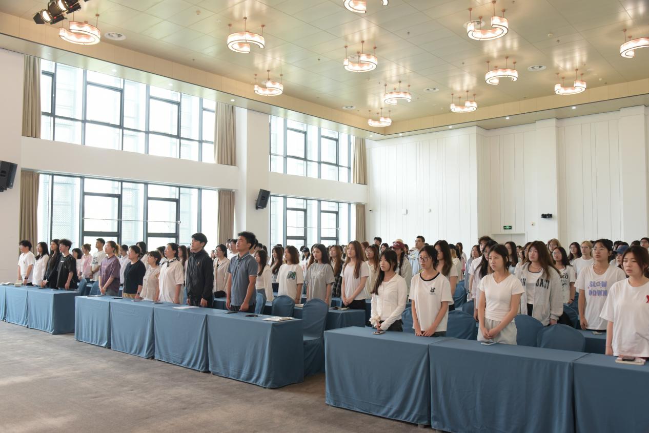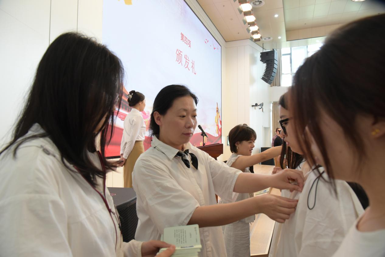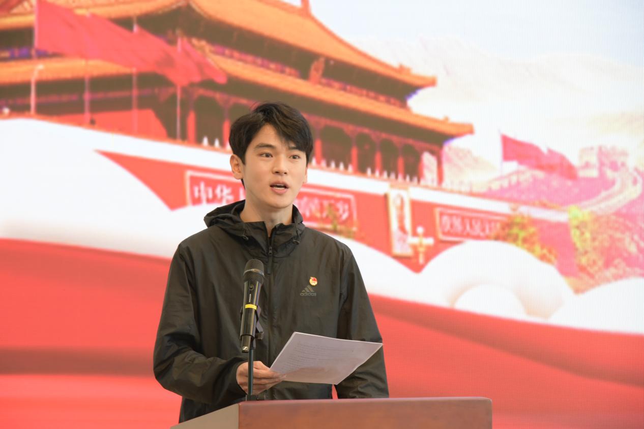 在主持人宣读新团员名单后,辅导员老师们和学院分团委成员为新团员们逐一颁发了团员证和团徽。团员证是对身份的认证,团徽则是责任的象征,新团员们满怀激动与自豪,郑重接过这份荣誉与责任的象征。颁发过程中,老师们的亲切话语和鼓励让新团员们感受到了团组织的温暖与力量。宣誓礼环节将仪式推向高潮。在领誓人的带领下,全体新团员庄严宣誓,承诺遵守团章,履行团员义务,为实现中华民族伟大复兴的中国梦贡献青春力量。誓言铿锵有力,彰显了新时代青年的坚定信念与决心。新团员代表倪蓉蓉在发言中表达了对加入共青团的激动与自豪,承诺将以团组织为平台,不断提升自我,争做时代的先锋。优秀团员代表赵云煊也分享了个人在团组织中的成长经历与收获,激励新团员们勇敢追梦,不断前行。